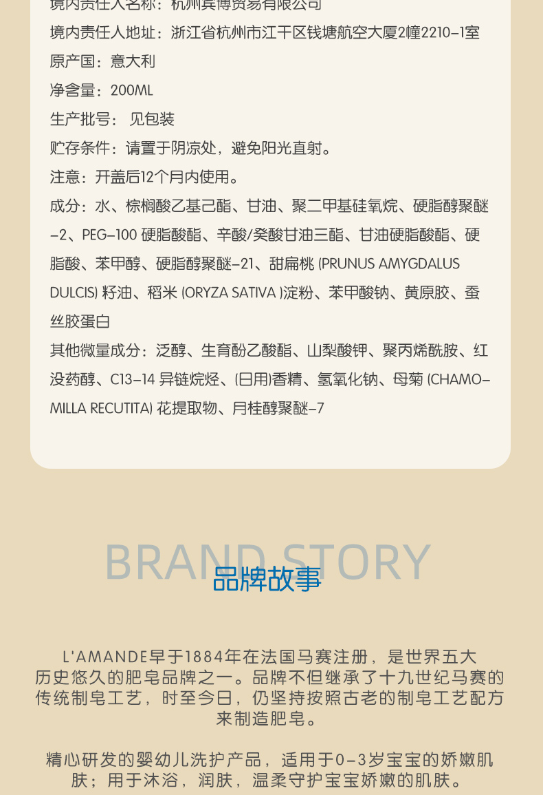品牌:L’amande 爱曼德 原产国:意大利